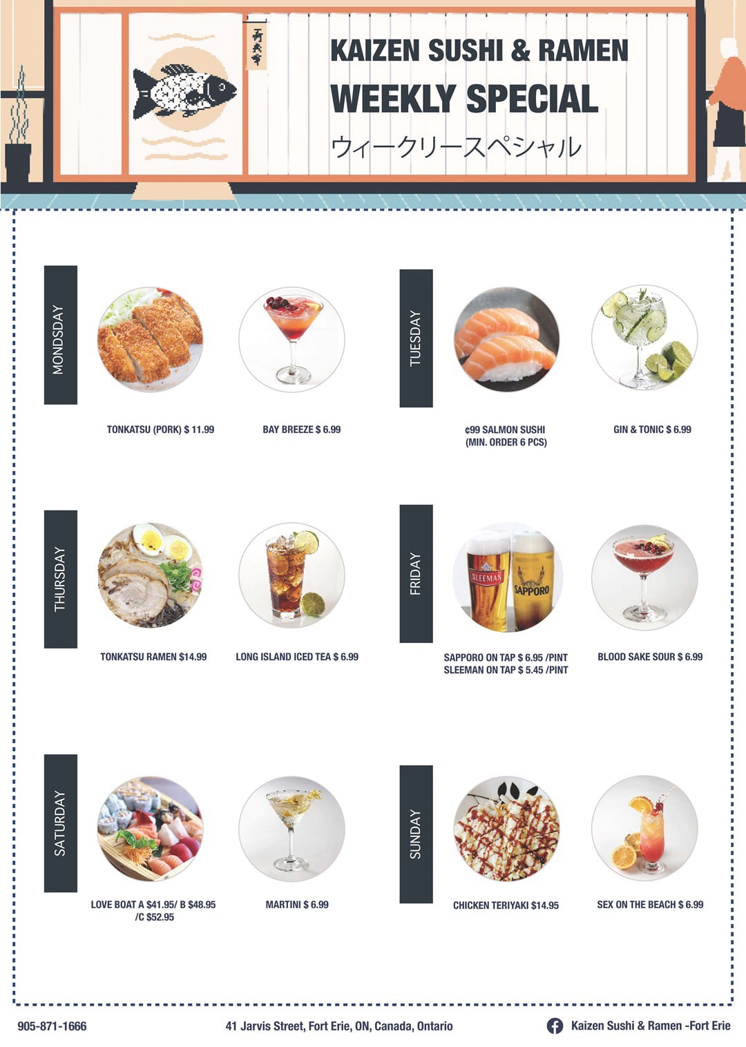 At Kaizen Sushi & Ramen, we blend tradition with innovation to bring you the freshest sushi and most flavorful ramen. Every dish is crafted with passion and precision, offering you an unforgettable Japanese dining experience. We look forward to welcoming you and sharing the spirit of Kaizen — continuous improvement — in every bite.
